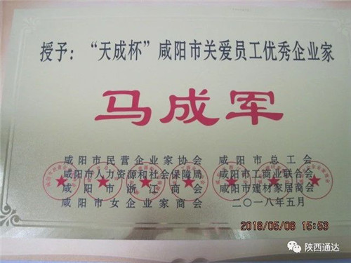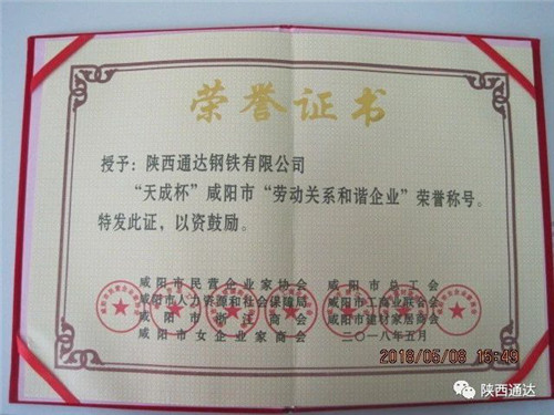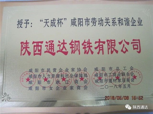 热烈祝贺陕西通达钢铁有限公司又获殊荣2018年5月8日早上9:00,由咸阳市民营企业家协会、咸阳市总工会、咸阳市人力资源和社会保障局、咸阳市工商业联合会、咸阳市浙江商会、咸阳市建材家居协会、咸阳市女企业家协会共同举办的关于表彰“天成杯”“咸阳市关爱员工优秀民营企业家”“咸阳市热爱企业优秀员工”“咸阳市劳动关系和谐民营企业”表彰大会在好望角酒店隆重举行。